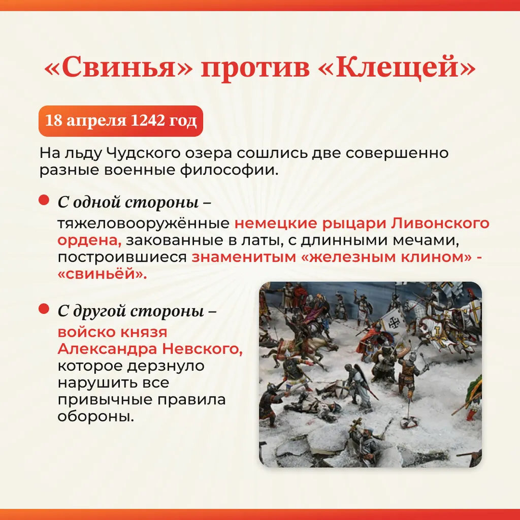 18 апреля 1242 год – День воинской славы России: День победы русских воинов князя Александра Невского над немецкими рыцарями на Чудском озере