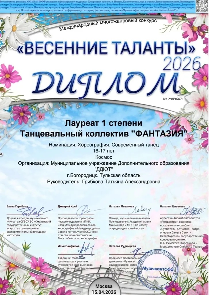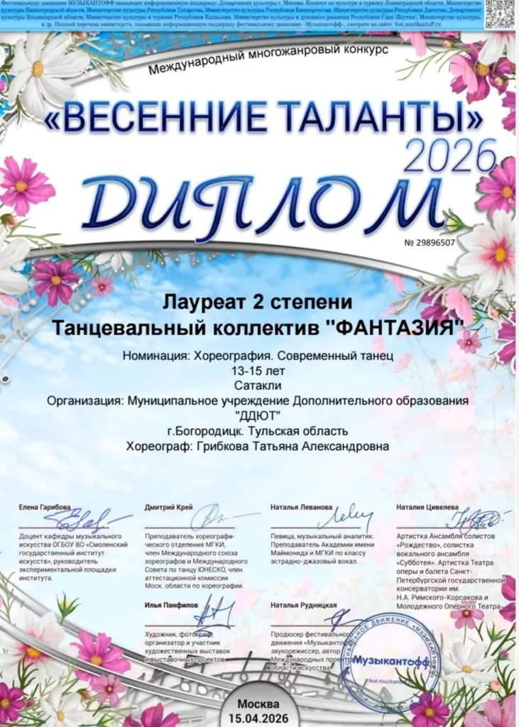Поздравляем танцевальный коллектив «Фантазия» и руководителя Татьяну Александровну Грибкову с заслуженными наградами на международном конкурсе «ВЕСЕННИЕ ТАЛАНТЫ – 2026»!